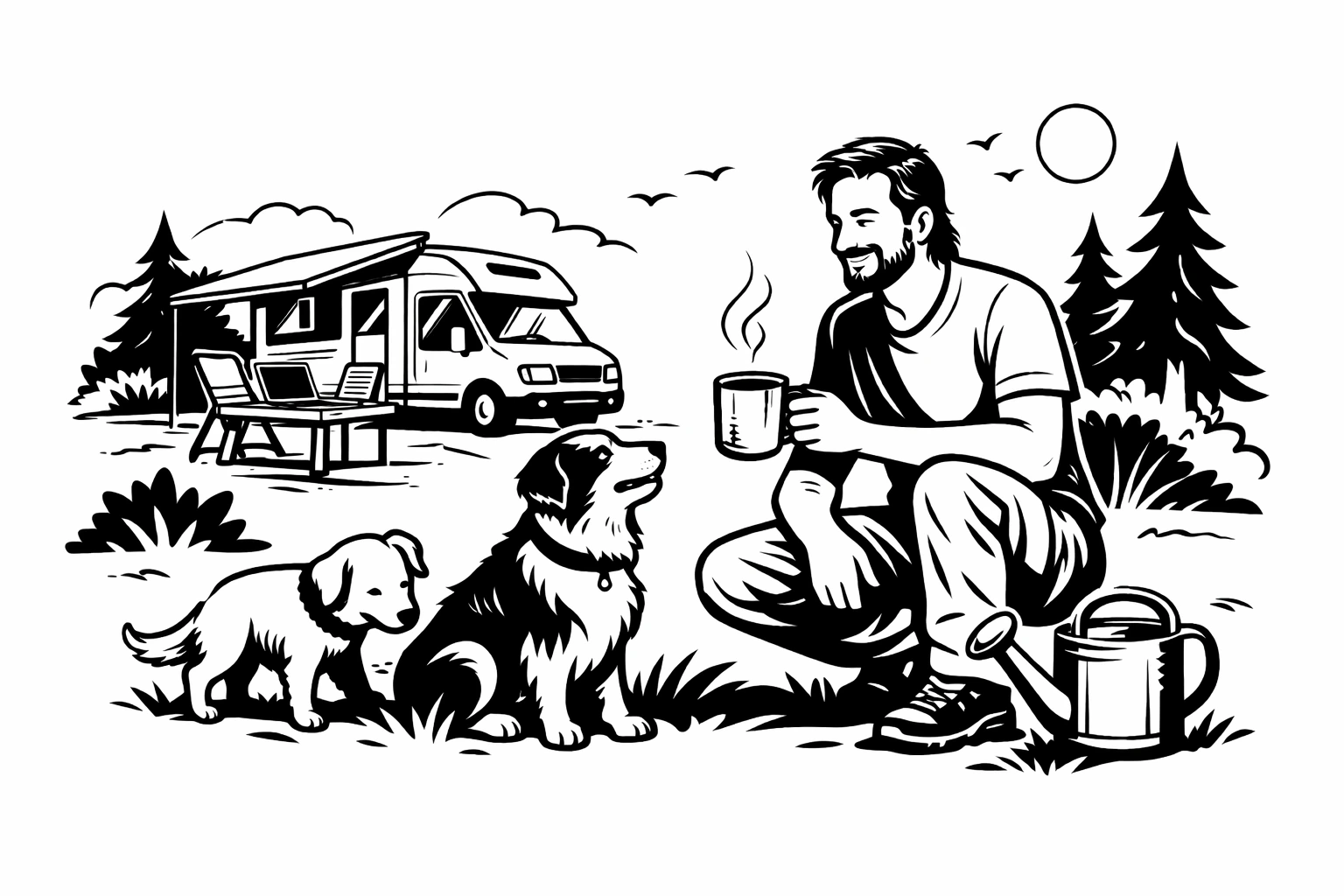 Ausgleich finde ich draußen: mit den Hunden unterwegs oder mit dem Womo auf Tour. Und ja – Kaffee gehört dazu. 🙂